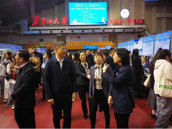 黑龙江大学校长王敬波、校党委副书记丁宏亲临招聘会现场指导工作,并详细了解用人单位需求。